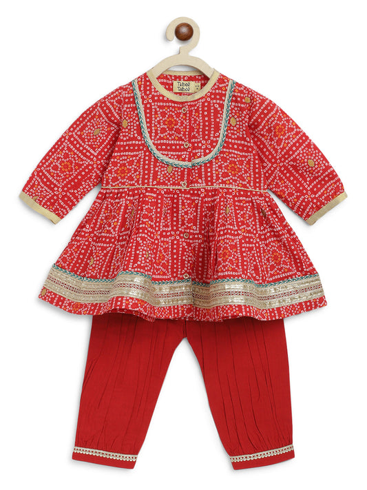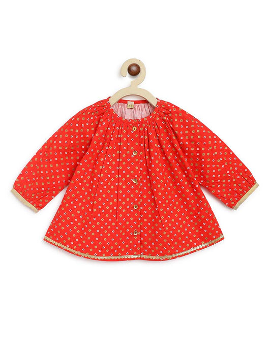 Baby Girl Bandhani Printed Jhabla Set-Red