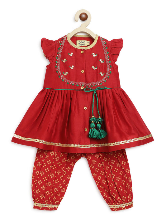 Baby Girl Bird Embroidery Jamna Set - Red