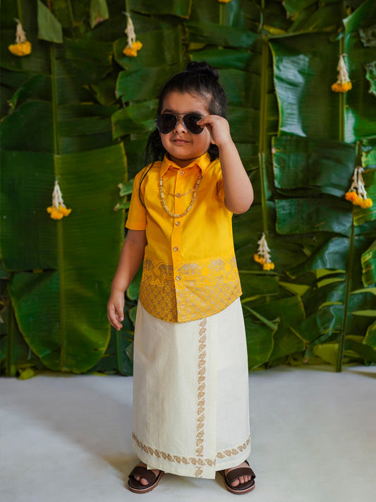 3 Pc Mundu Dhoti Shirt Set-Yellow