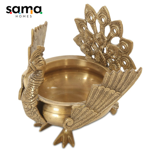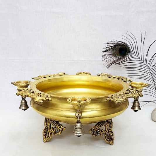 Brass Urli with Bell,Diya & Peacock Design | Decorati...