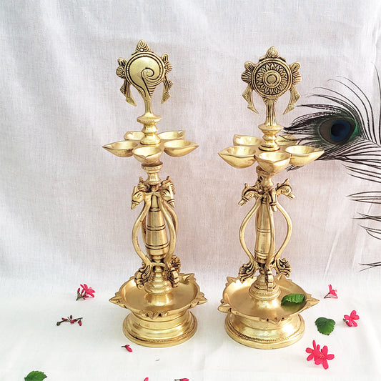 Brass Chakra & Shankha Standing Diya Set for Pooja | ...