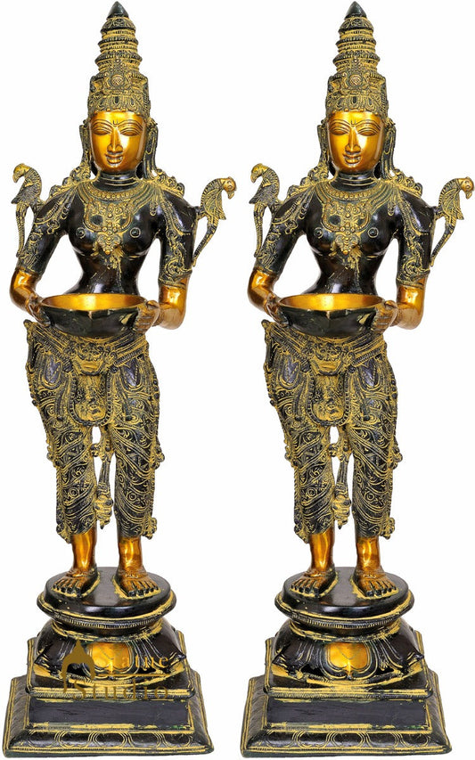 • Indian Antique Metal Celestial Khajuraho Apsara DeepLaxmi Pair Diwali Statue 31"