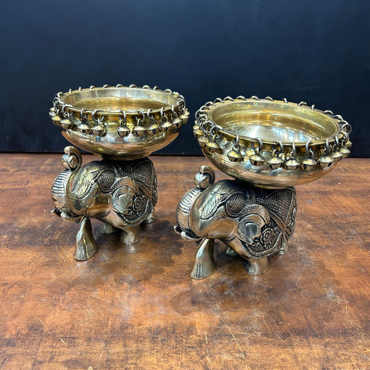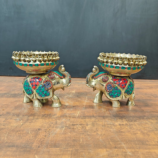 Indian Brass Animal Inlay Vastu Fengshui Home Décor Elephant Pair 11"