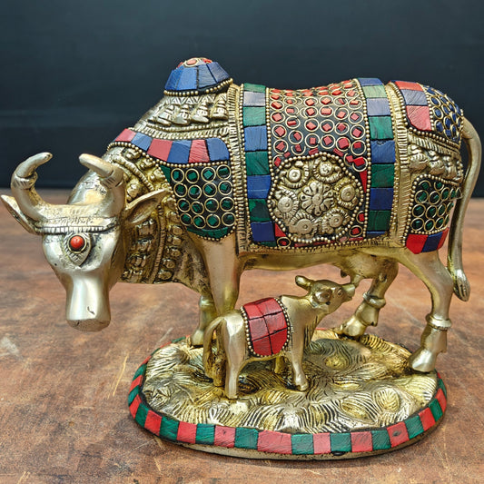 Brass Cow With Calf Stone Work For Home Temple Decor 6 Inch