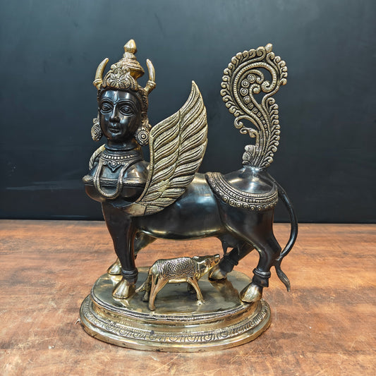 Brass Exquisite Kamdhenu Cow With Calf Statue 16 Inches