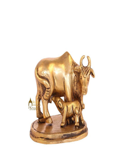 Brass Small Cow With Calf Statue For Religious Home Temple Décor Gift Idol 2.75"
