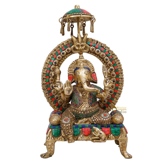 Brass Ganesha Idol Sitting On Throne Stone Work For Home ...