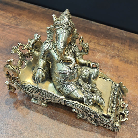Brass Ganesha Idol Resting On Peacock Singhasan 10 Inch