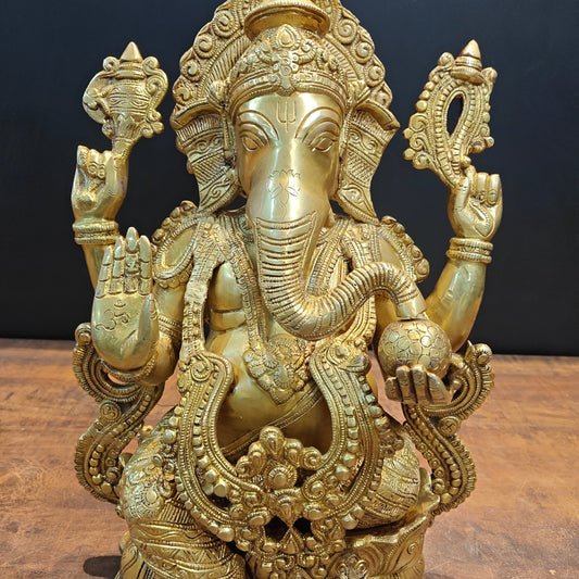 Brass Ganesha Idol Sitting on Base Handcrafted 16 Inches