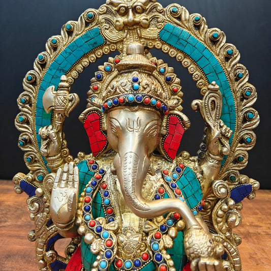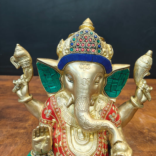 Brass Ganesha Idol With Stone Work For Home Decor 9 Inch