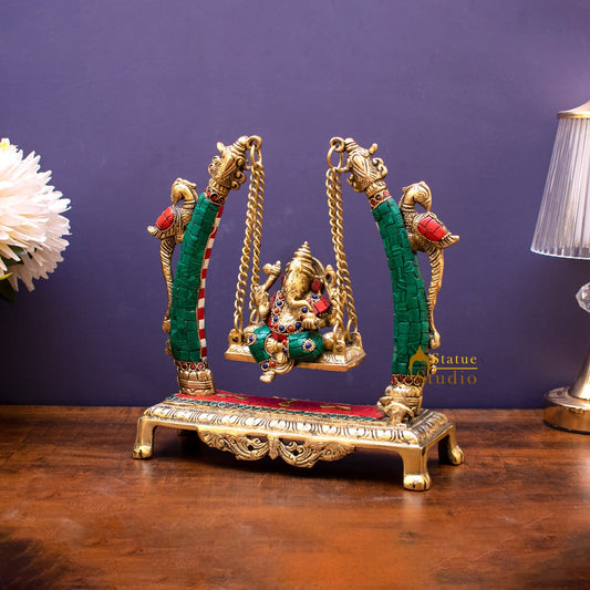 Brass Ganesha Jhula Idol Stone Work For Home Temple Decor...