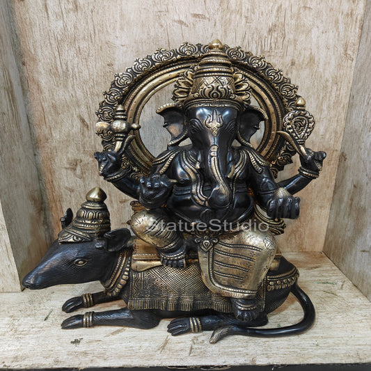 Brass Ganesha Statue Seated On Rat Antique Finish For Hom...