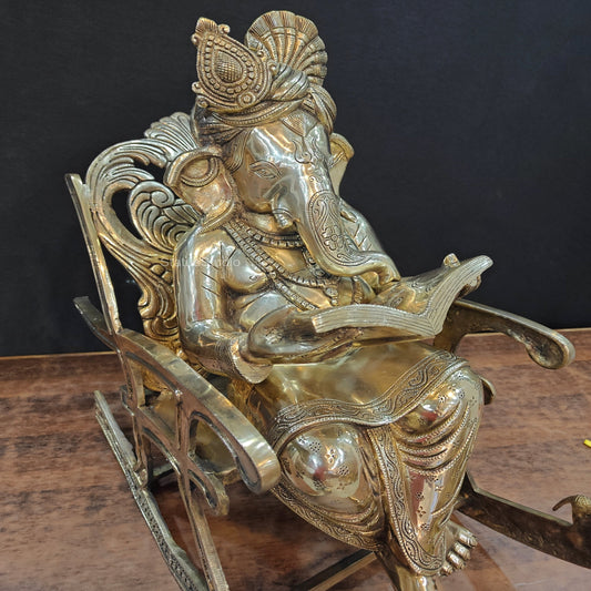 Brass Ganesha Statue Reading Book On Rocking Chair 2 Feet