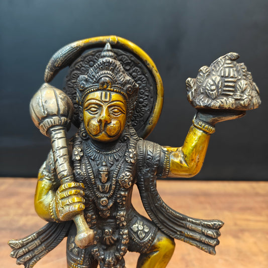 Brass Hanuman Idol Carrying Mountain Antique Finish 9"
