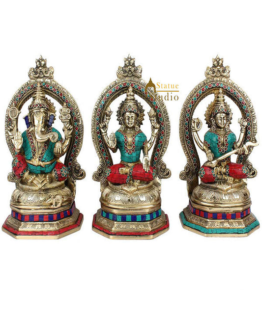 Brass Hindu God Goddess Ganesh Laxmi Saraswati Inlay Idol...