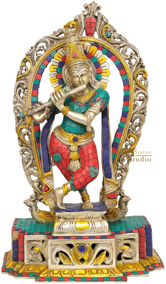 Brass Indian Hinduism Lord Krishna Playing Flute 16"