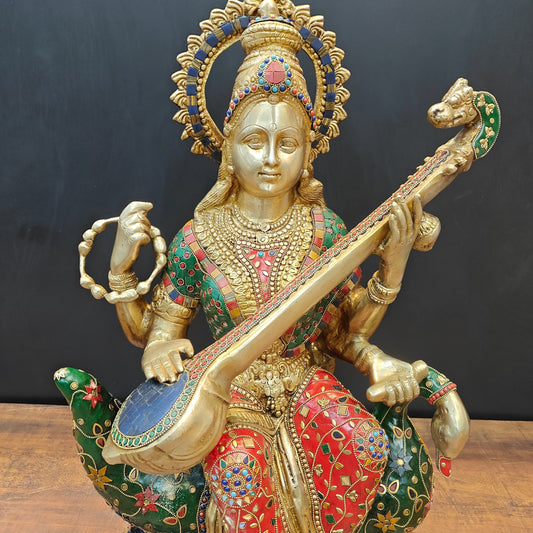 Brass Large Saraswati Statue On Swan Playing Veena 2 Feet