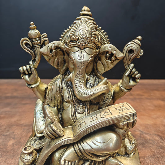 Brass Lord Ganesha Statue Writing Mahabharata 8 Inch
