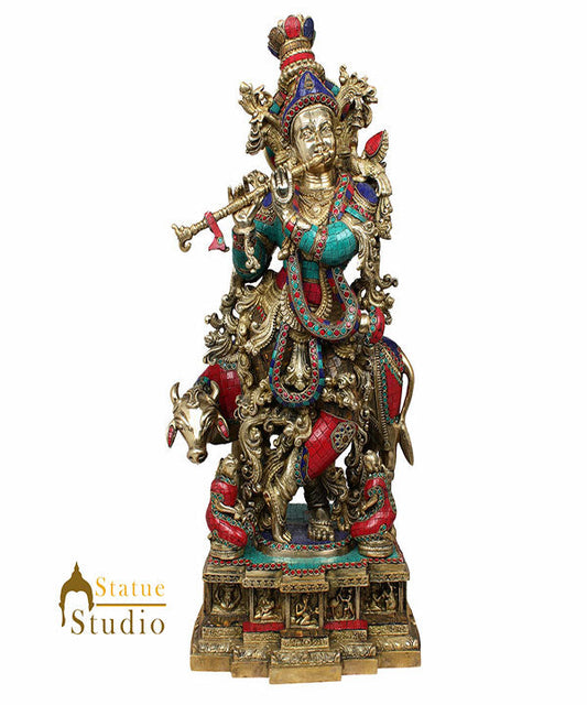 Large Indian God Krishna Murli Manohar With Cow Inlay Ido...