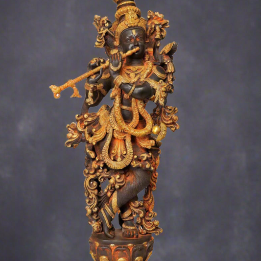 Brass Antique Krishna Statue with Flute (Peacock Stone In...