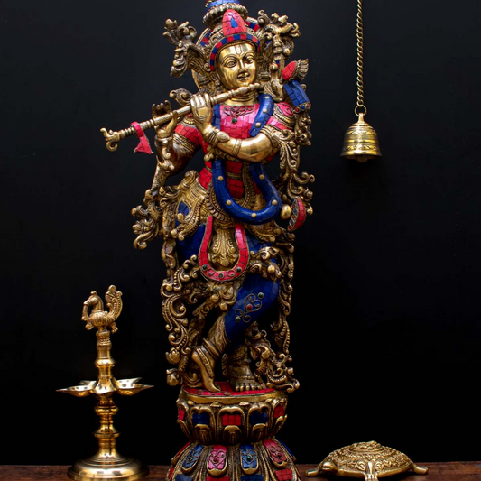 Brass Large Krishna Statue with Stonework 29" by StatueStudio
