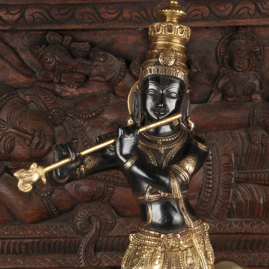 Brass Krishna Statue with Cow in Antique Black Finish 26" by StatueStudio