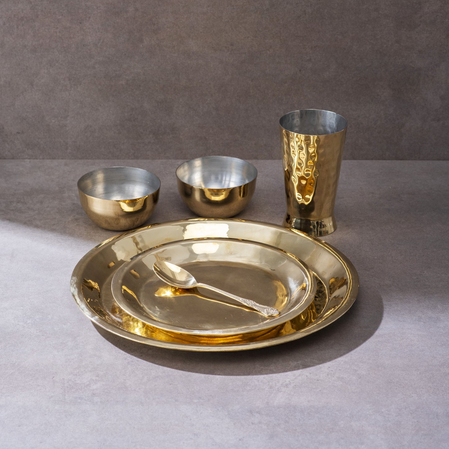 Brass Plate Set - 6 Pieces | Includes Full Plate, Quarter Plate, 2 Bowls, Glass & Spoon | Handcrafted Eco-Friendly Indian Dining Set